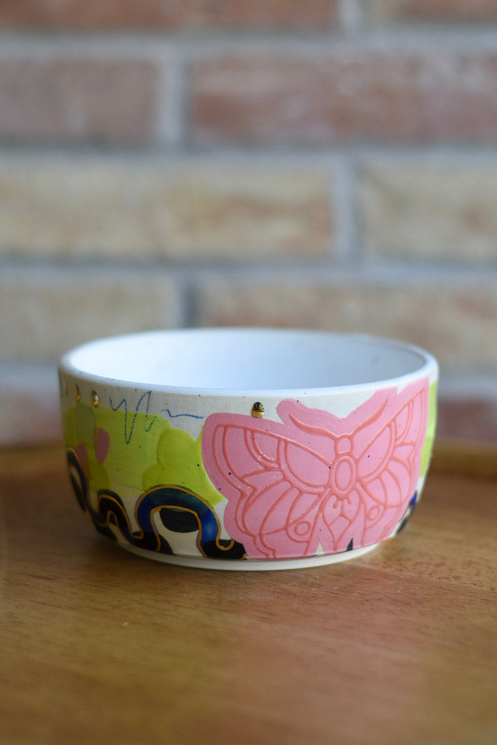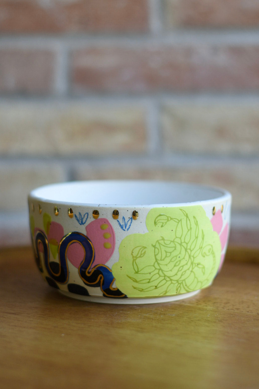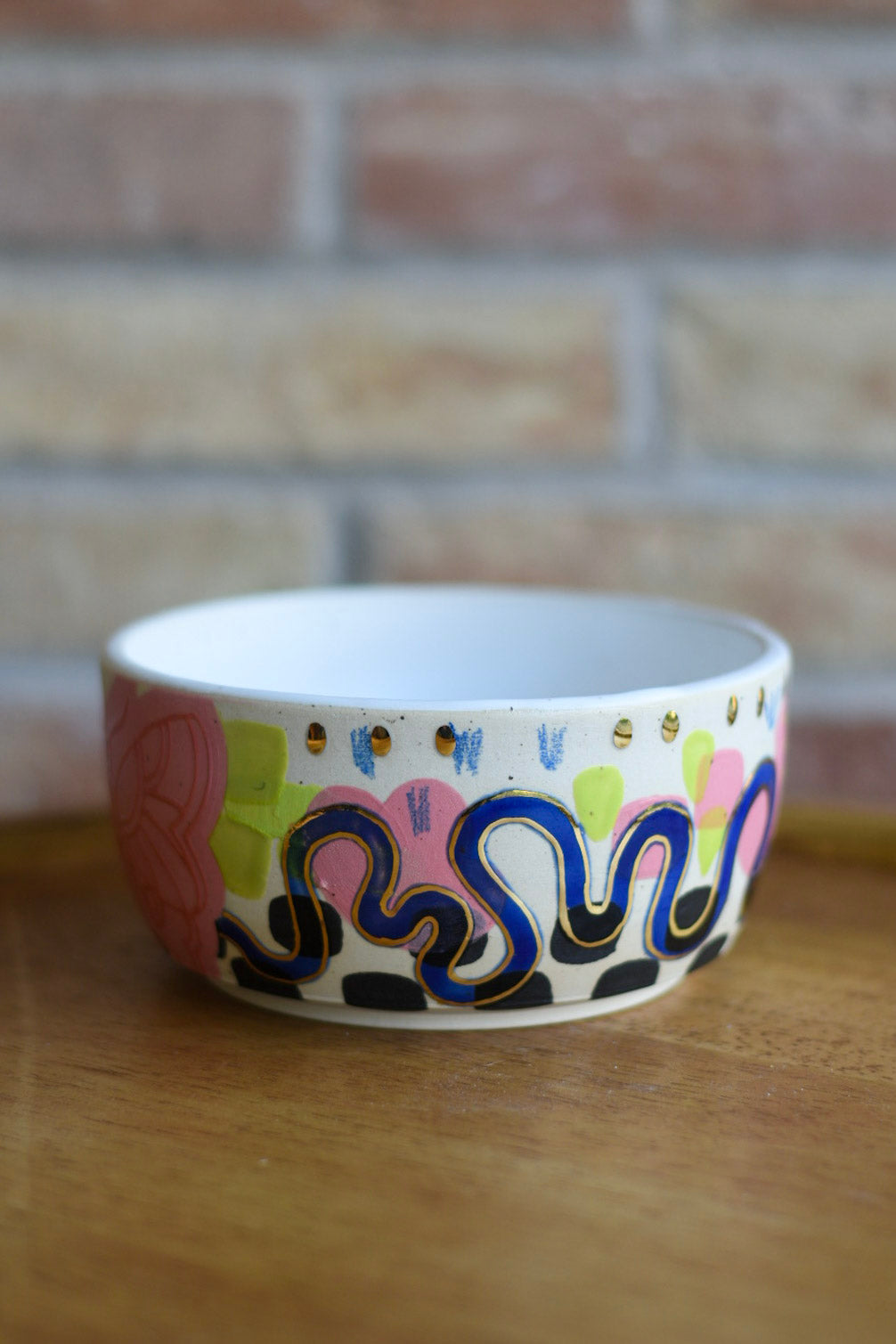 - Neon abstract design to exterior surface with hand painted and hand drawn glaze, underglaze, and underglaze pencil details